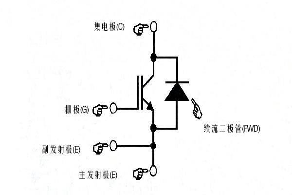 單管模塊的內部結構由數個igbt模塊并接,以達到所需要的電流量規格,能夠視為大電流量規格的igbt模塊單管。受機械強度和熱阻的限制,igbt模塊的管芯面積不能做得太大,大電流量規格的igbt模塊需要將多個管芯安裝到一塊金屬基板上。單管模塊外部標簽上的等效電路如下圖1所示,副發射極(第二發射極)接到柵極驅動電路,主發射極接到主線路中。