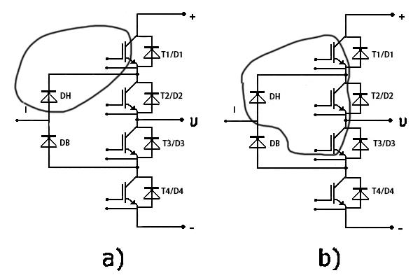 圖1.三電平NPC中某一種橋臂的換流回路。a)短換流回路;b)長換流回路