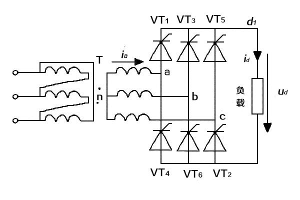 如圖所示為三相半控橋帶阻感負載,按照需求要考慮到電動機的電樞電感與電樞電阻,故為阻感負載。其線路運行特性是共陰極組晶閘管模塊一定要觸發才可以換流,而共陽極組二極管往往是在自然換相點換流。因此一周期時間中依然換流6次,3次為自然換流,其他3次為觸發換流。變壓器為△-Y型接法。變壓器2次側接成星形取得零線,而1次側接成三角形規避3次諧波流入電網。