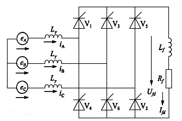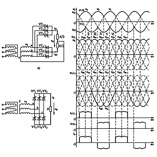 在制造業中使用極其普遍的一類整流電路。其本質是1組共陰極與1組共陽極的三相半波可控整流線路的串連。習慣性將當中陰極連接在一塊的3個可控硅這模塊(VT1、VT3、VT5)稱之為共陰極組;陽極連接在一塊的3個可控硅這模塊VT4、VT6、VT2)稱之為共陽極組。